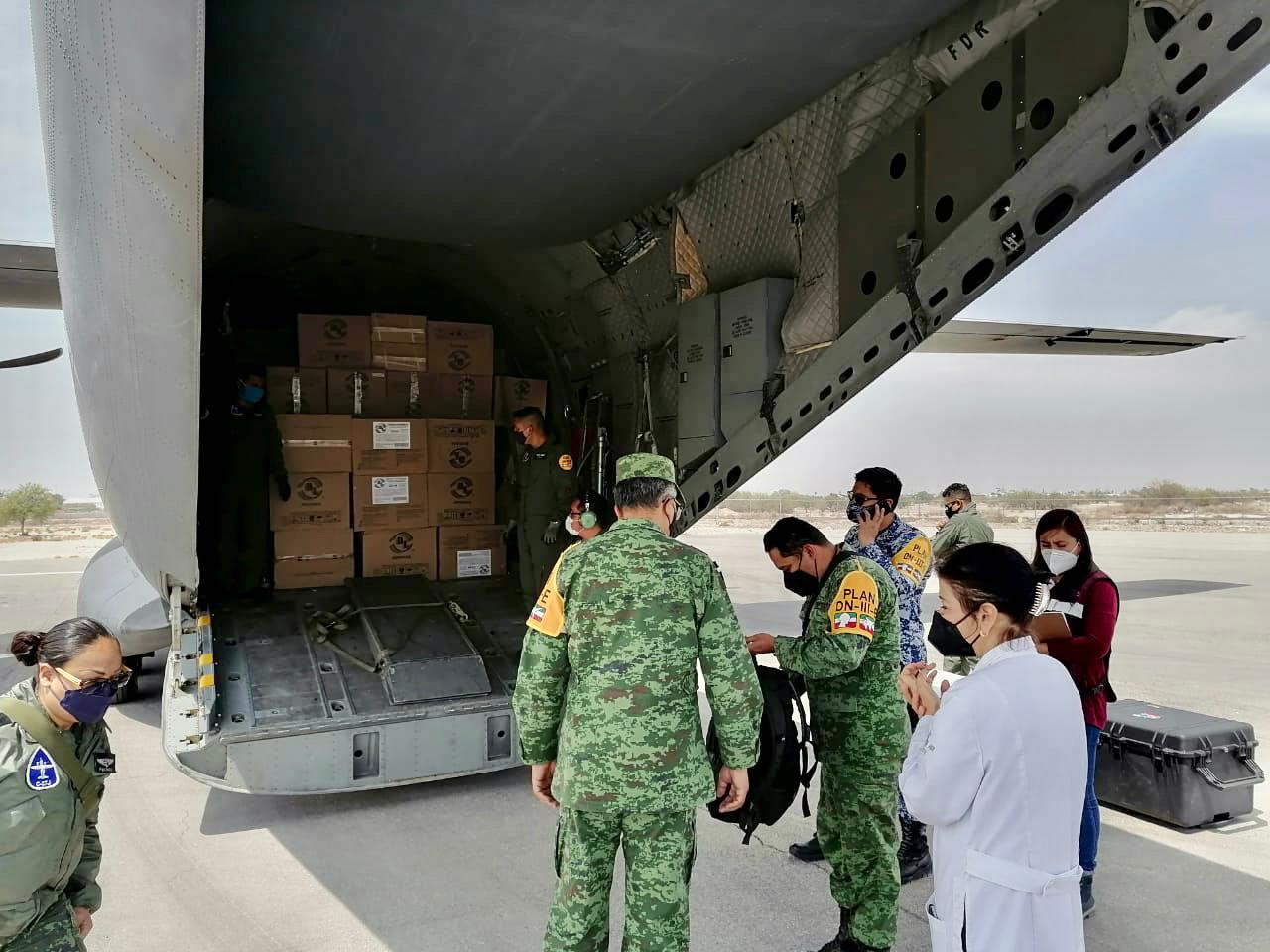 [Un total de 18 mil 80 vacunas SINOVAC y las primeras 2 mil 360 dosis CANSINO arribaron este lunes a la base militar aérea en la Ciudad de Torreón.